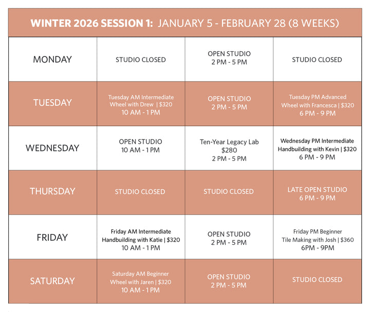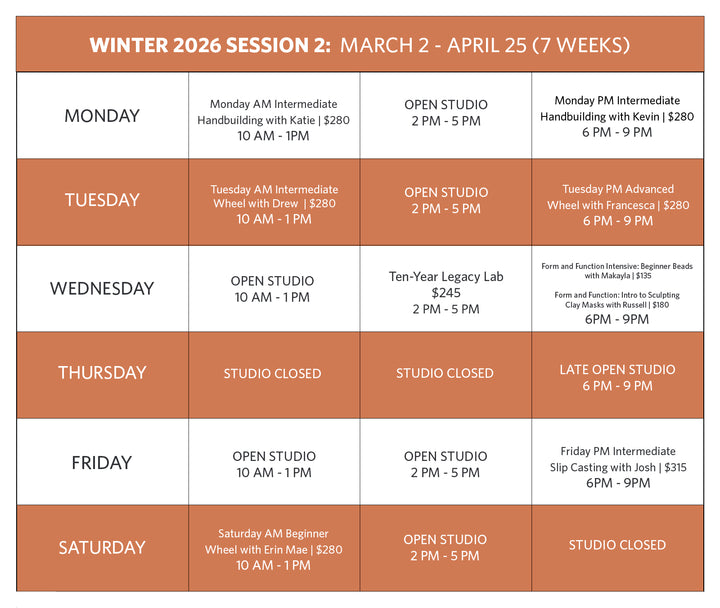 We welcome beginners to join our Saturday AM Beginner Wheel-Throwing class, while the Intro to Sculpting Clay Masks intensive is reserved for those with previous clay experience.